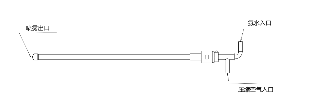 氨水通过小孔利用压力进行机械雾化,进入混合室内,混合室体积渐扩,速度变慢,同时压缩空气在混合室进入氨水雾中,由于混合室空间增大,压缩空气在氨水内瞬间爆破,使氨水进行雾化,氨水喷雾经过扁平的喷口喷出。